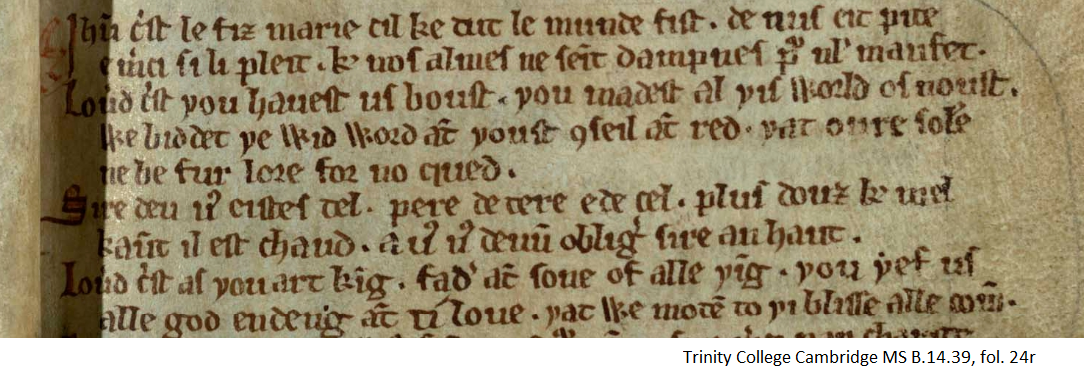 The text can be found on folio 24r in the Trinity College, Cambridge MS B. 14. 39. Inside this manuscript we find over 140 religious and didactic texts in English, Anglo-Norman, and Latin. [1] The first nine lines are divided into four stanzas—two in Anglo-Norman and two in English—each containing three to four different sentences. Each stanza begins in the left margin and then the other lines in that stanza are indented. The first and the third stanza are written in Anglo-Norman and the second and fourth are written in English.