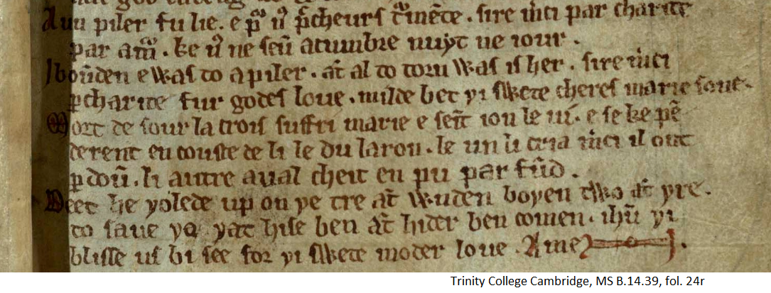 This piece of text can be found in Trinity, College Cambrige MS B.14.19, on fol. 24r. The text is trilingual; the languages used are ME, French and Latin. It seems as if the scribe may not have been very proficient in Middle English, since he conjoins articles and words such as ‘apiler’, which is most likely ‘a piler’ or PDE ‘a pillar’.