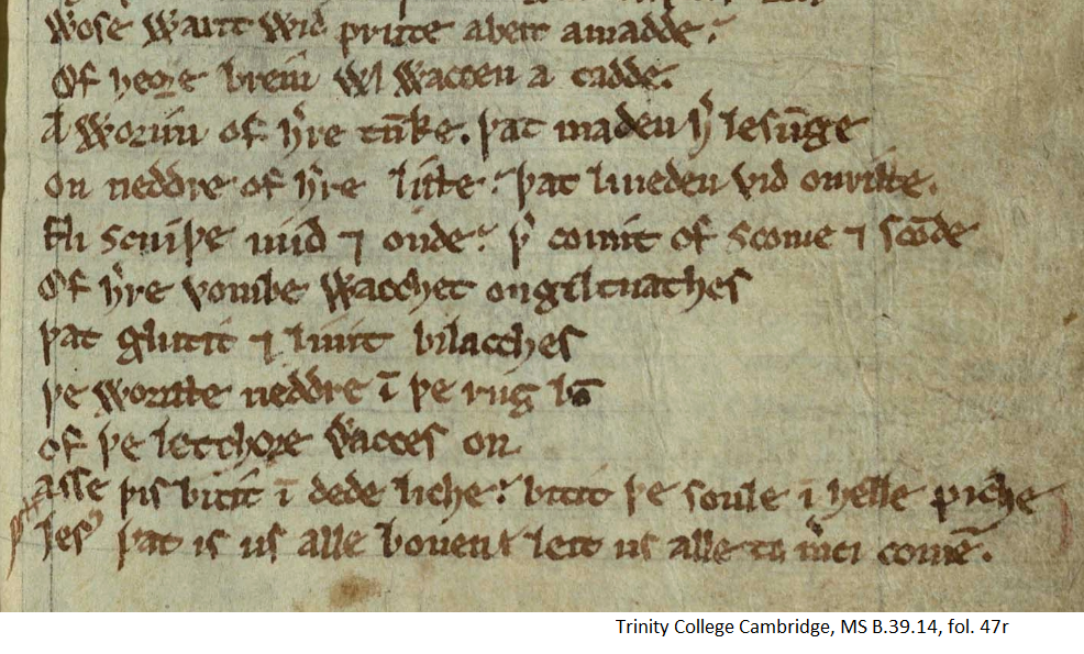 As such, the poem is clearly a religious text and fits neatly in its manuscript context; Elaine Treharne has described the Middle English texts found within Trinity College B. 14. 39 as predominantly ‘penitential and devotional lyrics and hymns.’ [1]