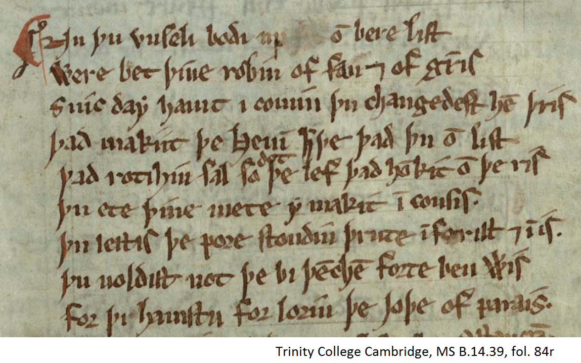 The manuscript was copied in the West of England, and the dialect has been identified as West Worcester, although it shows some Northern characteristics. Typically spelling in this dialect retained some archaic elements from Old English, like the ‘thorn’ (þ) and the sign to abbreviate ‘and’ (7; ll. 2,7). The third-person endings in this poem are somewhat shared between Southern and Northern dialects: makit, hauit, dot. The Northern ending in -es is not visible in the present text. There is a prevalence of -i in places where an –e is expected: makiit (maketh, l. 4, 6), robin (roben, l.2), icomin (icomen, l.3), noldist (noldest, l. 8). There is one instance of third person plural (hem), which follows the Southern / East Midland pattern, in contrast to the Northern pronoun “them,” which was derived from Old Norse. One typical Northern feature that appears in this poem is ‘sal’ (instead of ‘shal’, l. 5). [9] So the dialect appears to be in a sense intermediate, containing some Northen and some Southern forms.